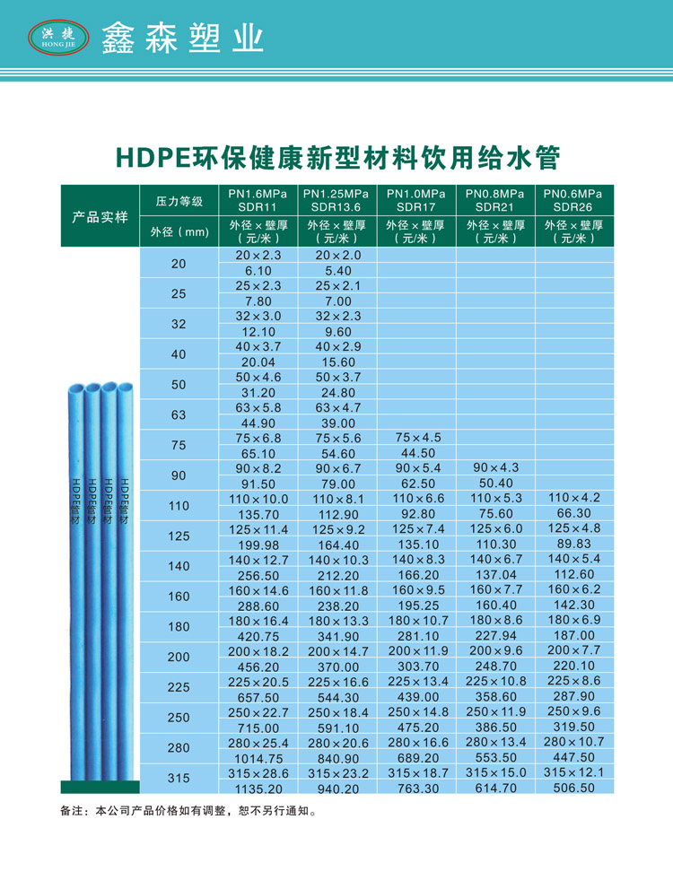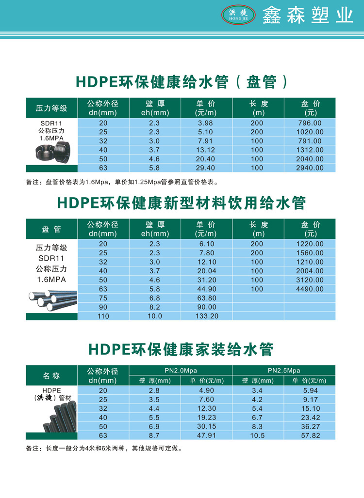 HDPE管材管件报价书